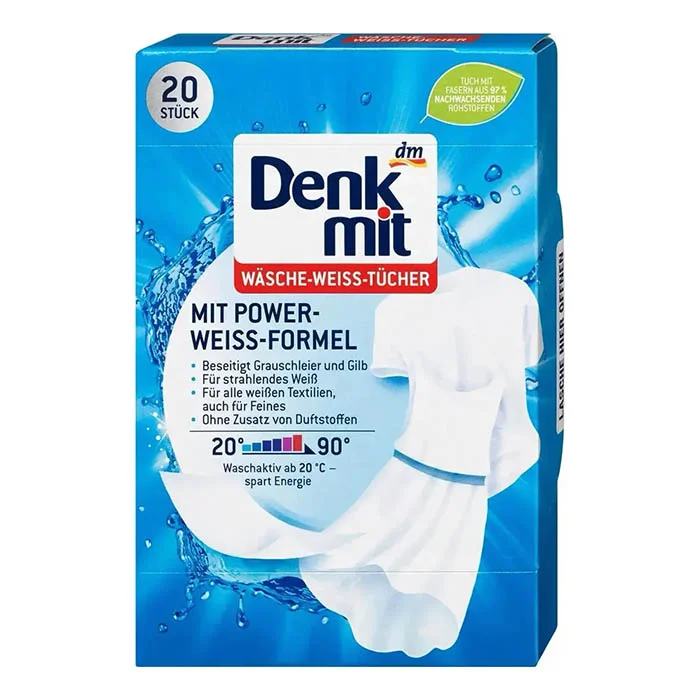 Серветки Denkmit для прання білого одягу ефективно усувають сірість і жовтизну навіть із найделікатніших тканин. Ваші улюблені сорочки, рушники та постільна білизна знову стають сяючо-білими — без пошкодження волокон і без необхідності кип’ятіння.