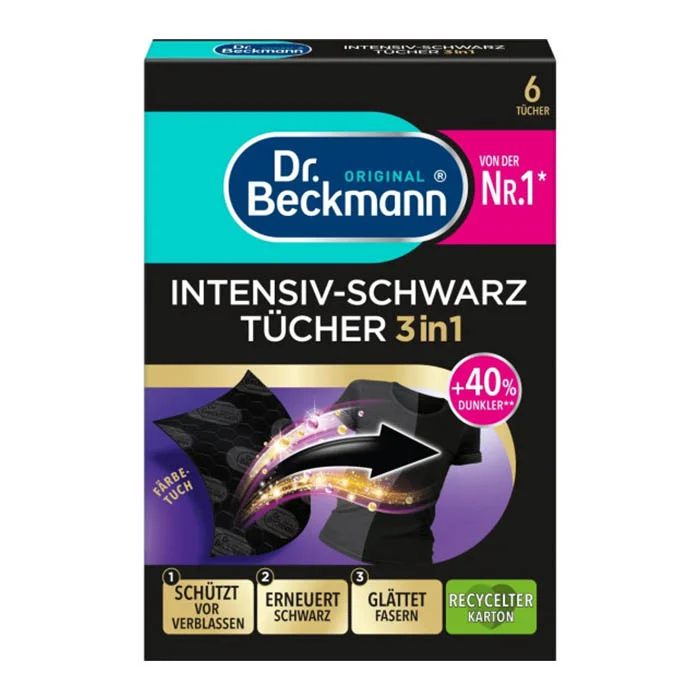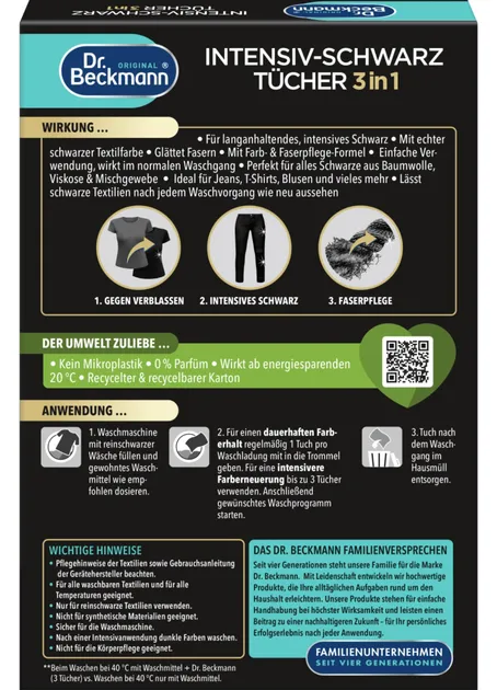 “Ваш улюблений чорний одяг став сірим? Серветки Dr. Beckmann з натуральною фарбою повертають інтенсивний чорний колір та доглядають за волокнами тканини прямо під час прання. Підходять для будь-яких чорних тканин. Забудьте про вицвілі джинси чи футболки — поверніть їм вигляд нових речей за одне прання.”